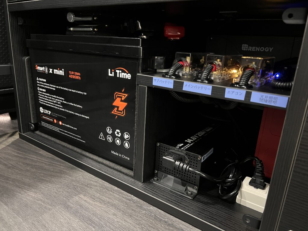 運転席側の専用BOXに電装系をまとめ、居住空間&電装&収納スペースをバランス良く配置